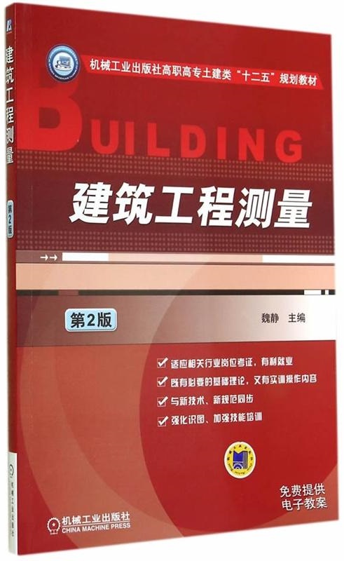 机械工业出版社高职高专土建类“十二五”规划教材 建筑工程测量 第2版 主编魏静 副主编廖建文 参编(以姓氏笔画为序) 仝国芸牟敦波刘珺 刘莉杜成仁林华 郑淑平黄曼 主审杨国富 机械工业出版社 本书参照高职高专和应用型本科教育土建类各专业测量学的基本要求编写。内容包括绪论、水准测量、角度测量、距离测量、电子全站仪测量、测量误差的基本知识、小地区控制测量、大比例尺地形图的基本知识、大比例尺地形图的测绘、 地形图的应用、 测设的基本工作、建筑施工测量、道路和桥梁施工测量、管道施工测量、GPS卫星定位技术和测量实验与实习。 本书具有较宽的专业适应面,在内容的组织上按必需、够用的原则,取材注意反映基本概念和基本理论,删除了一些繁琐的理论推导,注重实用性,力求体现职业教育的教材特点。 本书按照国家最新测量规范编写,可作为高职高专院校土建类专业及其他成人高校相应专业的教材,也可作为相关工程技术人员的参考用书。