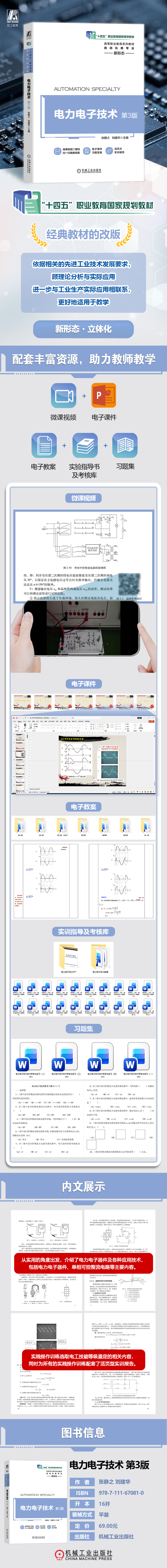 教材从实用的角度出发,介绍了电力电子器件及各种应用技术,包括电力电子器件、单相可控整流电路、三相可控整流电路、有源逆变电路、交流调压、无源逆变与变频电路、直流斩波等主要内容,其中第2~7章的实践操作训练选取电工技能等级鉴定的相关内容,同时为所有的实践操作训练配套了活页型实训报告。每章还配有一定数量的思考与练习题,以指导读者深入地进行学习,并通过“本章小结”对学习内容进行梳理和提炼。本书既可作为高职高专自动化、机电一体化、应用电子等机电类相关专业的教材,也可以作为其他相近专业的教材或参考书,还可以作为从事电力电子技术工作的工程技术人员和参加维修电工职业技能鉴定人员的参考书。为方便教学,书中的微课视频可通过扫描方式进行观看。