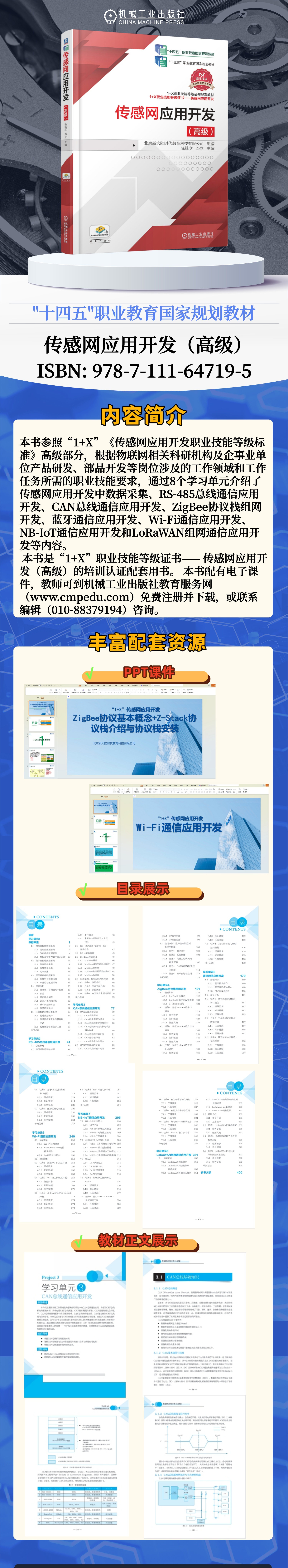 本书参照“1+X”《传感网应用开发职业技能等级标准》高级部分,根据物联网相关科研机构及企事业单位产品研发、部品开发等岗位涉及的工作领域和工作任务所需的职业技能要求,通过8个学习单元介绍了传感网应用开发中数据采集、RS-485总线通信应用开发、CAN总线通信应用开发、ZigBee协议栈组网开发、蓝牙通信应用开发、Wi-Fi通信应用开发、NB-IoT通信应用开发和LoRaWAN组网通信应用开发等内容。 本书是“1+X”职业技能等级证书—— 传感网应用开发(高级)的培训认证配套用书。 本书配有电子课件,教师可到机械工业出版社教育服务网(www.cmpedu.com)免费注册并下载,或联系编辑(010-88379194)咨询。