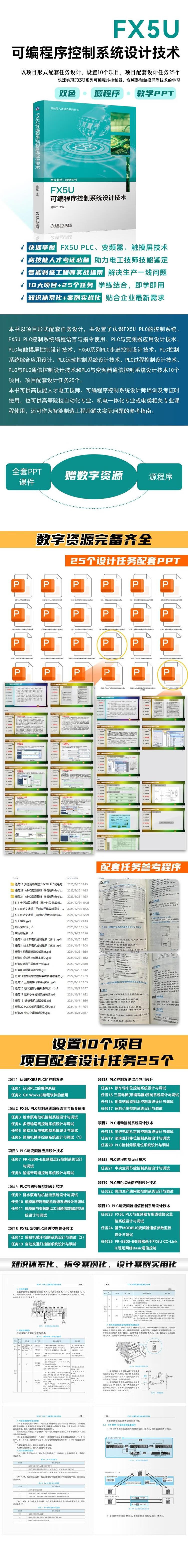 25个工业级设计任务:如三层电梯控制、机械手系统、停车场车位管理、伺服定位等,每个任务含“要求-目标-指引-评价”闭环训练,强化实操能力。