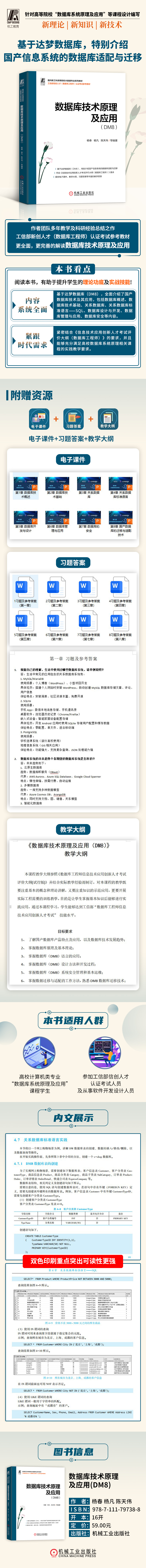 本书基于达梦数据库(DM8),全面介绍了国产数据库技术及其应用。全书共9章:数据库概述、数据库技术基础、关系数据库、关系数据库标准语言——SQL、数据库设计与开发、数据库管理与应用、数据库安全、国产数据库的迁移与适配、DM数据库综合设计示例——在线购物平台。本书案例丰富、特色鲜明,特别介绍了国产信息系统的数据库适配与迁移。本书紧密结合《信息技术应用创新人才考试评价大纲(数据库工程师)》的要求,能够充分满足高校数据库系统原理相关课程的实践教学要求。 本书可作为高校计算机、信息类专业“数据库系统原理及应用”课程的配套教材,也可作为参加工信部信创人才(数据库工程师)认证考试人员及从事软件开发设计人员的培训用书。对于已具备数据库设计基础的技术人员,阅读本书可以进一步了解国产数据库应用技术,提高数据库应用开发能力。