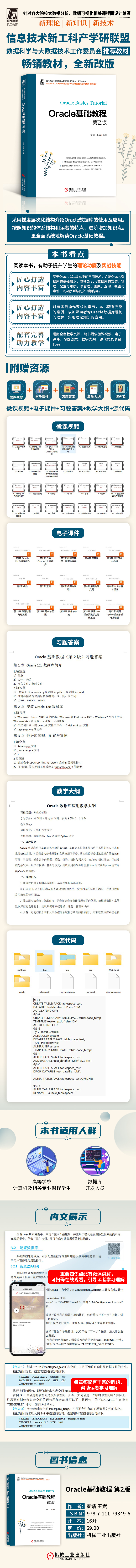 本书基于Oracle 12c版本中的常用技术,介绍Oracle数据库的基础知识,包括Oracle数据库的安装,管理、配置与维护,表管理、函数、查询、视图与索引,以及序列与同义词;接着介绍PL/SQL的基本语法、存储过程与触发器、用户与权限、备份与恢复;最后结合Java语言和Python语言,通过具体的实例,深入讲解使用Oracle数据库的方法。部分章节配有习题,并且重要知识点配有微课讲解,以指导读者深入地进行学习。 本书既可作为高等学校计算机及相关专业的教材,也可作为管理信息系统开发人员的技术参考书。